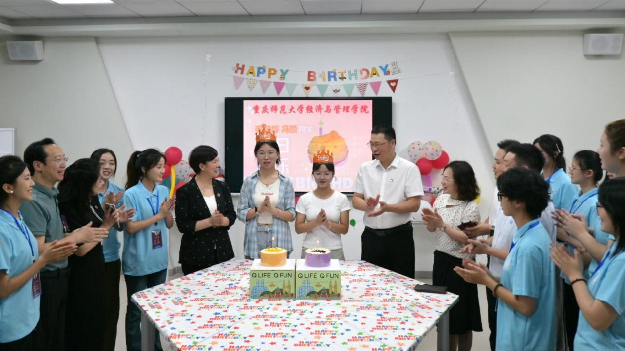为这两位新生精心准备了生日庆祝活动,校领导们与同学们一起唱响生日歌,并为两位同学送上一份特别的生日礼物。张艳书记向两位新生表达了特别的祝福,并鼓励他们在新的人生阶段要奋力拼搏,立大志、明大德,通过大学阶段的学习锻炼,努力把自己培养成德智体美劳全面发展的栋梁之才。王国胤校长在讲话中强调,新时代的青年肩负着实现中华民族伟大复兴中国梦的重任,他鼓励新生们要把个人梦想与时代发展和国家需要结合起来,在勇敢追梦的过程中,不忘为国家的发展贡献力量,成为有理想、有担当的新时代好青年。