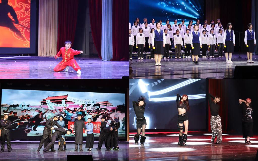 学子的美好祝愿和殷切厚望。朗诵《另一个同一个》铿锵有力,引发观众对自己的初心和梦想更进一步的探索。防诈小品《校园诈骗》以幽默讽刺的取名和别出心裁的剧情设计揭露诈骗手段,增强人们的防范意识。舞蹈《Touch》舞动的音符和轻快的节拍,展现青春的朝气蓬勃。情景剧《觉醒青年》演绎了旧时期青年们保家卫国的决心与意志,激励当代青年有所担当,为国奉献。