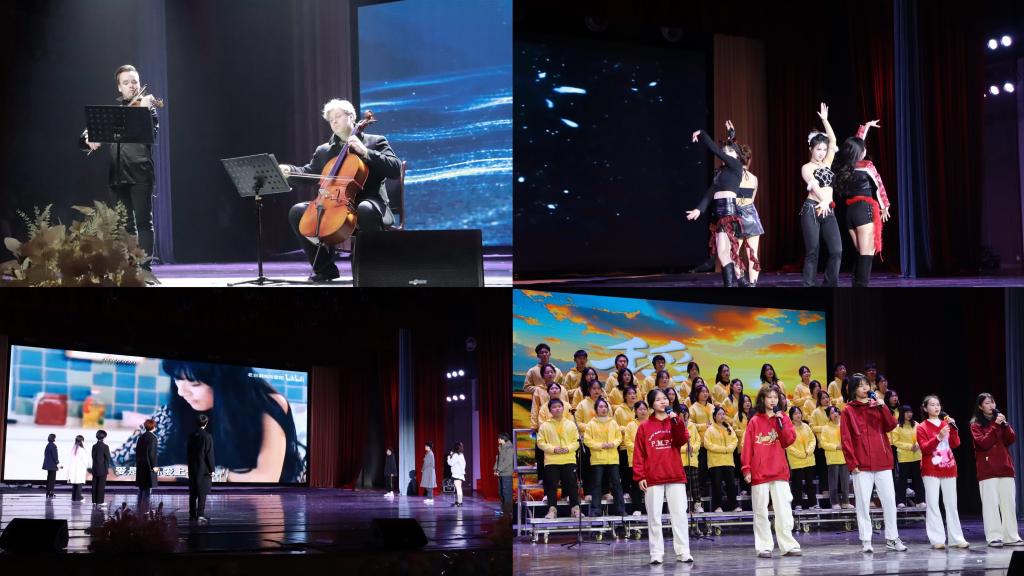 谢尔盖·伊林诺夫和费奥多尔·阿莫索夫两位音乐大师的乐器演奏拉开序幕,给观众们带来一场绝伦的视听盛宴。舞蹈串烧《black and pink》以动感的舞姿展现青春的活力,激情澎湃的音乐即时燃炸现场,引起台下阵阵欢呼。手势舞合唱《我乘着风飞过来》歌声悠扬,鼓励人们勇敢追寻自己的梦想,乘着风飞向更高想天空。舞蹈《恋爱告急》的舞者们在舞台上绽放青春的舞步,诠释年轻一代对爱的看法。情景合唱《稻香》旋律轻快,五彩的纸飞机满载着新生们对美好未来的憧憬。趣味配音《爱情公寓》用生动有趣的方式演绎出每一角色的灵魂,激励人们珍惜当下,奋勇前行。