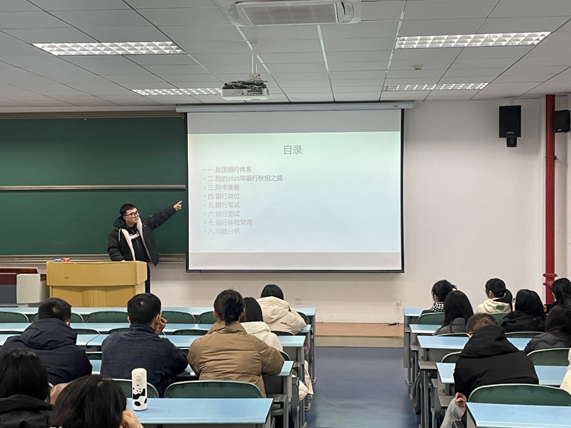卢柯屹同学通过清晰的讲解,帮助同学们全面认识了我国银行体系,并结合自身经历,详细分享了银行秋招的关键环节。他强调简历制作应突出专业技能和岗位匹配度,选岗时要结合个人兴趣和职业规划进行匹配。在笔试和面试阶段,他指出,笔试内容广泛,需要针对性复习;面试则注重综合素质考察,尤其在无领导小组讨论中需展示团队协作与逻辑思维能力。分享过程中,他还与同学们积极互动,细致解答疑问,提供了许多实用建议。