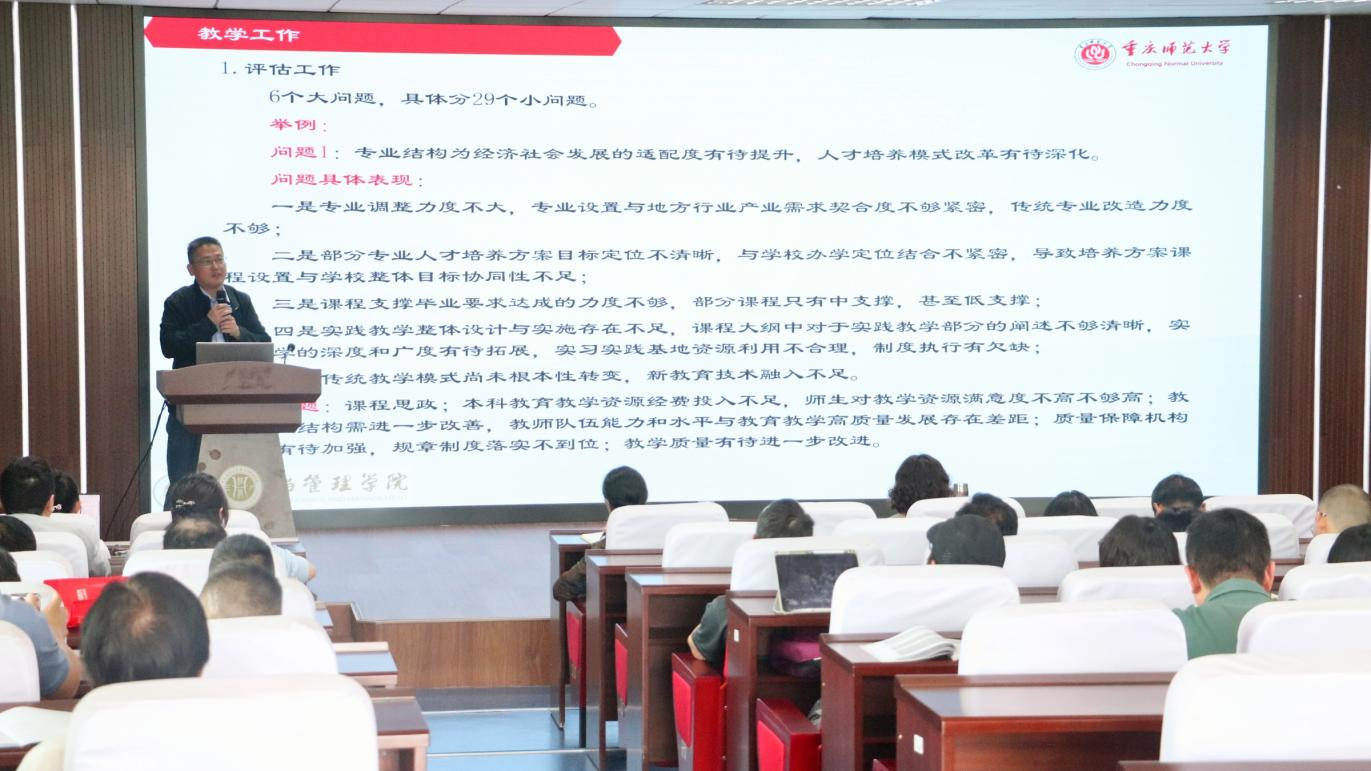副院长段俊就学校教学评估专家组提出的问题进行汇报,强调专家组提到的所有共性问题,都需大家引起重视,并在未来的教学过程中,注意改进课堂教学管理。随后,段院长就近期人才培养方案修订和本科生毕业论文推进工作进行布置。