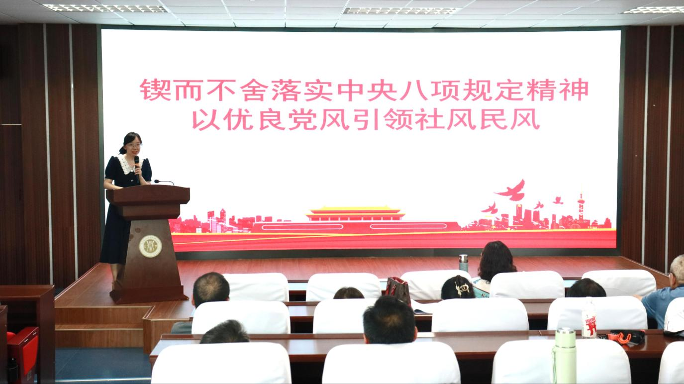 随后,党委委员任缙就教职工政治理论学习作专题宣讲。她围绕“锲而不舍落实中央八项规定精神”主题,阐释了优良党风引领社风民风的意义,系统回顾了党的十八大以来贯彻中央八项规定精神的成效与经验,传达了习近平总书记近期相关重要讲话和指示精神,要求全体教职工提高政治站位,严守纪律规矩,扎实投入工作。
