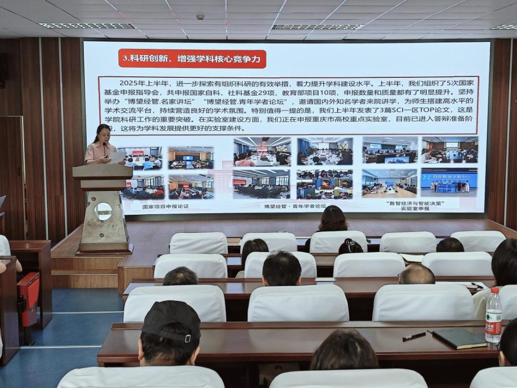 在党建、教学、科研、学生管理等方面取得显著成绩。党建方面,深入学习贯彻党的二十大、二十届三中全会精神,推进提级巡察整改,强化纪律意识;教学上,完成本科教育教学审核评估,荣获重庆市高校教师教学创新大赛一、二等奖,修订完成人才培养方案,线上线下创新招生宣传等。科研上,申报国家基金项目29项,发表3篇SCI一区TOP论文,筹备申报重庆市高校重点实验室等。学生管理上,强化思想教育,保障安全稳定,2025届本科毕业生就业率达91.33%。暑期将持续推进巡察整改、开展数字化素养培训、筹备新文科实践创新大赛、拓展就业机会、组织暑期三下乡实践活动、支持教师学术交流等工作。未来,麻将游戏电脑版