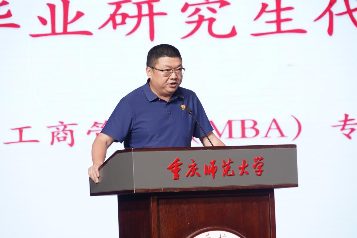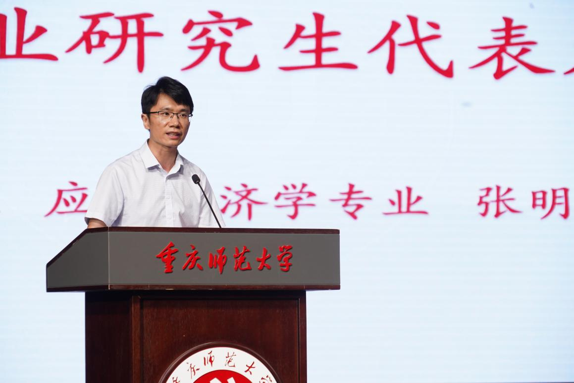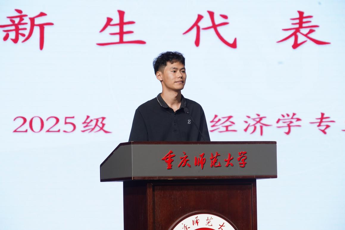 之后,新生代表罗泽江发言。他分享了自身的支教经历,并结合所学专业特色,阐述对研究生阶段学习的规划与期待。他表示将在教师指导下,以谦逊态度恪守学术规范,专注学术研究、践行格物致知,力求完成符合自我成长与时代要求的研究生阶段学习。同时,他向教师们表达工作顺利、桃李芬芳的祝愿,向同学们送上学业有成、前程似锦的祝福,并倡议全体新生携手以“厚德笃学、励志创新”的理念共同奋进,奔赴未来。