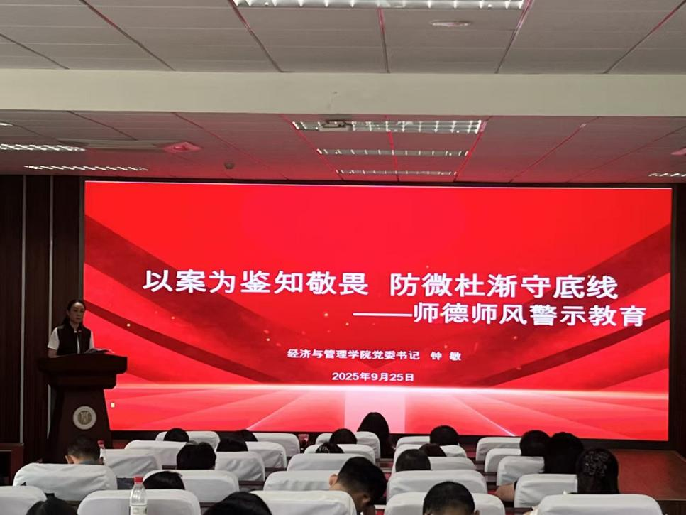 党委书记钟敏以“以案为鉴知敬畏,防微杜渐守底线”为题开展师德师风警示教育,通过剖析意识形态、师生关系、学术不端等方面的典型案例,提醒教师严守职业底线,强化自我约束。临近中秋、国庆双节,她还就师生安全教育与管理工作作出部署,要求教师和辅导员切实履行责任。