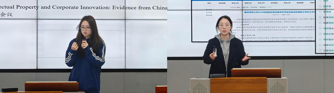 经验分享环节上,两位学子结合自身成长经历,带来了干货满满的实用建议。姜淇聚焦学业提升与科研实践,从专业绩点优化、科研项目参与、学术思维培养等方面分享了具体方法,并详细梳理了保研申请的关键时间节点与各项申请材料的准备技巧,为有保研意向的同学提供了清晰的行动指南。任缘圆则从多元选择与信息获取的角度出发,针对就业、考研、保研等不同发展路径,提出了精准定位自身优势、高效搜集相应信息、科学制定准备计划的实用策略,帮助同学们拓宽了发展视野。