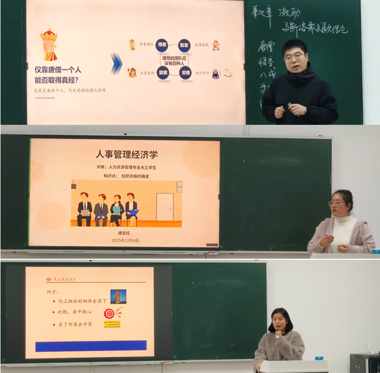 公开课上,岳奥博、黎君和谭志红三位新教师分别围绕“管理学中的马斯洛需求层次理论”“概率论与数理统计的样本空间与随机事件”和“人事经济学中的招聘与甄选”等核心内容进行教学展示。教师们围绕教学目标,精心设计教学环节,运用案例分析、情景模拟等多元化教学方法,展现了扎实的专业基础和良好的教学素养。