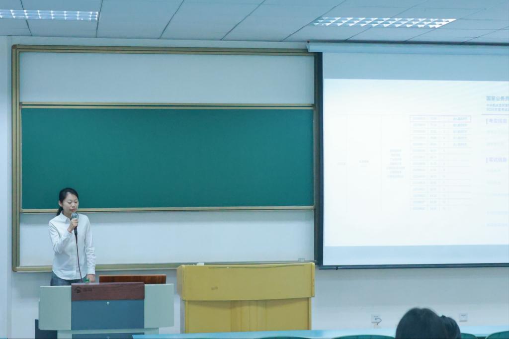 2023级产业经济学专业廖凌宁、管理科学与工程专业李嘉仪两位同学担任主讲人,两位同学分别通过人才引进、四川省考成功上岸广安区商务局和绵阳市梓潼县政府,现场围绕公务员考试备考经验开展专题分享,2024级全体硕士研究生参与。