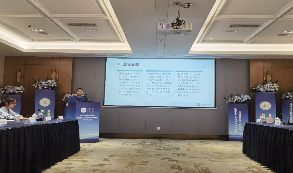 经济学系杜家廷教授参加论坛并作了主题为“新质生产力与制造业发展韧性关系”的汇报发言。杜家廷教授以成渝地区双城经济圈建设为背景,从发展新质生产力的战略意义、新质生产力对制造业发展韧性的提升作用、新质生产力对制造业发展韧性的异质性影响、新质生产力对制造业发展韧性的作用机制等多维视角向与会专家学者进行了深入汇报,得到与会专家学者的高度评价。杜家廷教授提交的研究成果《新质生产力对制造业发展韧性的提升效应研究》获得论坛征文三等奖。