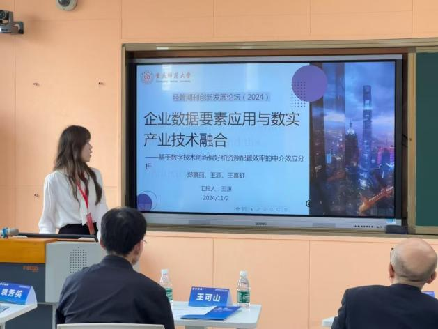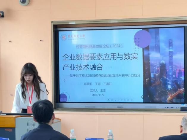在论坛的“应用经济学类”平行分论坛上,王源同学进行了题为《企业数据要素应用与数实产业技术融合——基于数字技术创新偏好和资源配置效率的中介效应分析》的学术汇报,详细介绍了数据要素作为数字经济时代的重要生产力对数实产业技术融合的推动作用,为企业推动数实产业技术融合,促进高质量发展提供了理论支撑与政策启示。该论文在大会总结中获评“A等论文”。