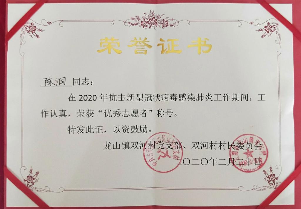 家住四川省古蔺县龙山镇双河村的陈润,主动加入当地的抗疫志愿者队伍,完成了宣传疫情基本知识,登记务工人员返村前的详细地址,对在疫情比较严重的地区务工的人员进行劝导隔离等各项任务,由于表现突出,被当地评为抗疫“优秀志愿者”。