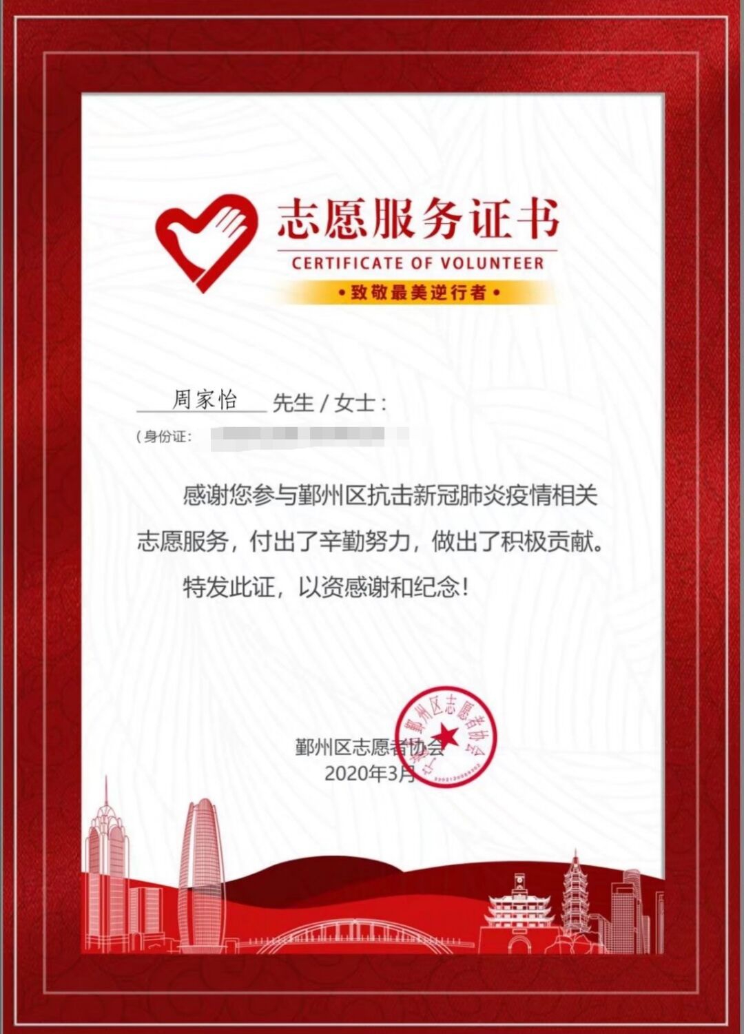 2020年2月10日至29日,周家怡同学志愿参加了浙江省宁波市鄞州区宜家社区新型冠状病毒肺炎抗疫志愿服务工作。她主要负责进出人员的体温测量、情况登记等。这次的志愿者服务,她深刻感受到面对疫情,千千万万的志愿者的每一份热,每一份光,都是战胜疫情的强大力量。