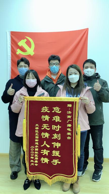 周雪飞同学主动报名参加了济南广播电视台党员干部职工代表组成志愿突击队下沉到济南市天桥区北园街道办事处的水园、荷香村、明园、枫景园和石桥东5个社区,参与一线防疫工作。工作期间,她迎难而上、主动担当、尽职尽责,协助社区推进各项防控工作,完成了组织交予的任务,赢得了社区居委会的一致称赞。