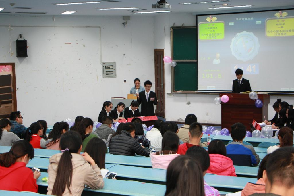 首先主持人向大介绍了本次辩论的主题——“中国当今是否应该推行以房养老”。随后,本次比赛的对阵双方先后入场并进行了简单的自我介绍,正方是来自15级工商管理类一、二班的队伍,反方则是来自15级经济学一班的代表队。