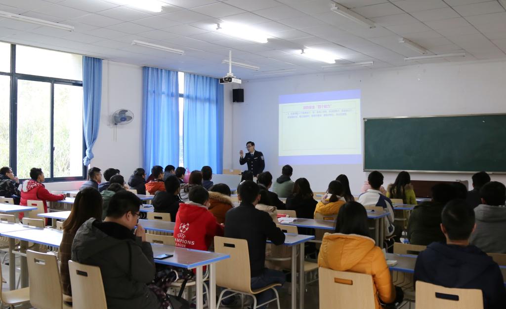 党委副书记任源钢致辞,并邀请重庆安居防火知识宣传培训中心消防安全培训员唐露轩教官上台进行讲座。唐警官表示,每个人都应该掌握消防安全的“四个能力”。即检查消除火灾隐患能力、扑灭初级火灾能力、组织疏散逃生能力和消防宣传教育能力,这四种能力都是人们在预防和面对火灾等情况下所必须掌握的。随后唐警官展示高校校园火灾的危害性及相关的触目惊心的案例,以这些典型案例为素材,重现火灾事故现场,对火灾根源、火情走向、预防办法、正确自救、高校规定、法律法规等方面进行全面且深入的讲解与剖析。唐警官的讲座极具特色,他幽默风趣的语言,伴随着生动传神的动作表情,让在场人员集中精力认真学习,在笑声中掌握消防知识,提高消防能力。