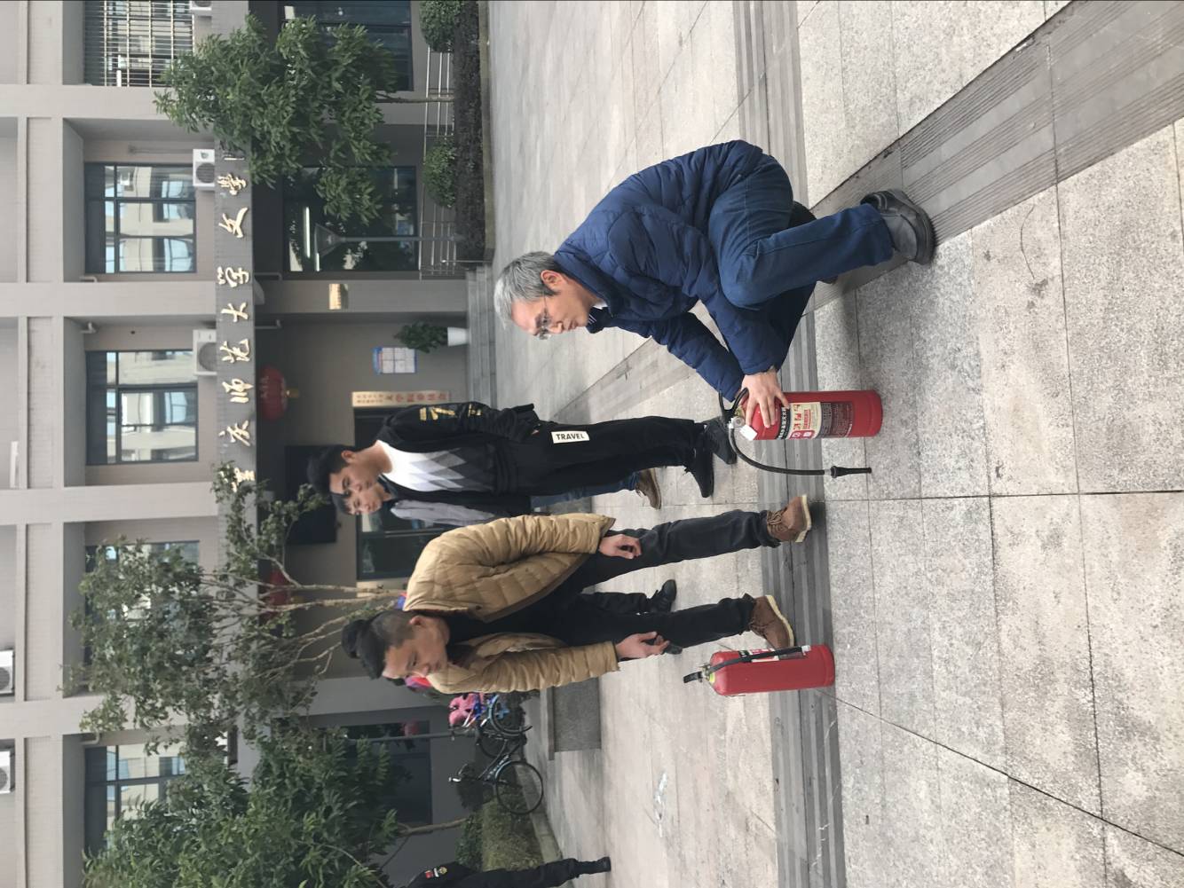 在消防安全知识讲座结束后,全体人员在汇贤楼外空地上进行消防实战演练。消防人员为全体人员演示高压水枪、灭火器等消防器材的使用方法、注意事项和急救常识。师生们参与其中,进行灭火器材实际操作。