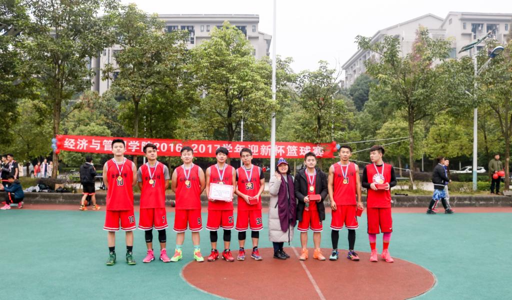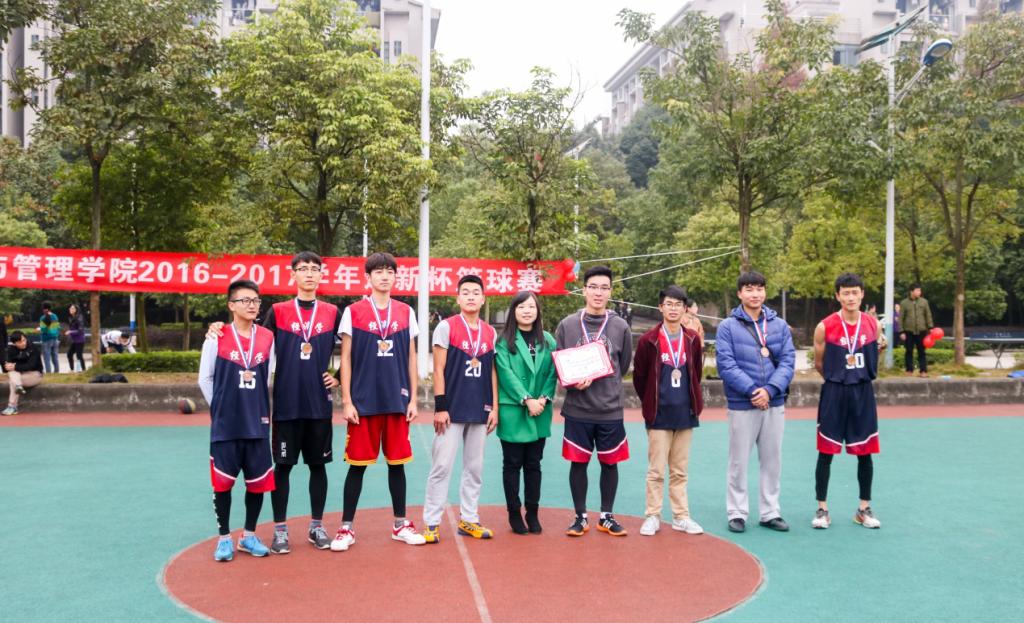 辅导员为获胜队伍颁奖并合影留恋,到此“迎新杯”篮球比赛圆满结束。