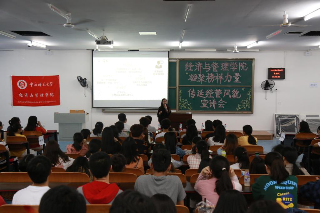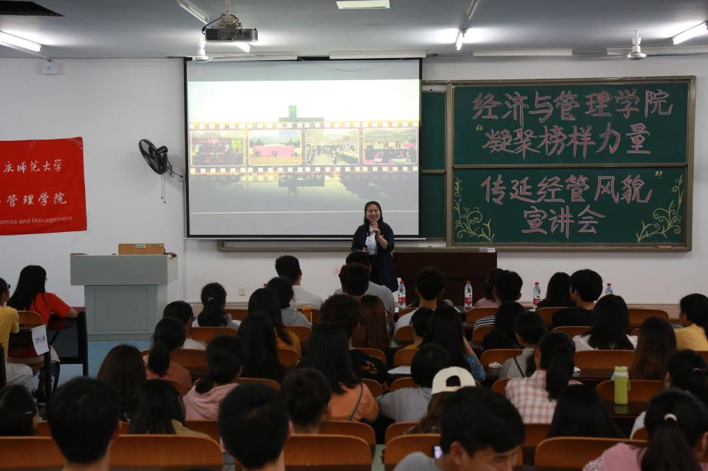 宣讲中,杨双同学讲述了2016级财务管理1班从初建到如今的先进集体的一路成长。他们秉承“博学睿思,严谨勤学,明智拓展,与时俱进”的班训一路向前,勇敢追梦。周文同学用自己的四年学习时光向同学们分享了目标和自律的重要性。在大一时,她树立考取西南大学心理学研究生的目标,在学习事关中,一边兼顾自己的本专业学习,一边自学心理学。同时抓住每一个锻炼自己的机会,积极参加比赛,获得了多项荣誉并且参加西南大学心理学夏令营的资格,今年被西南大学心理学成功录取。肖悦意同学以“不忘初心,方得始终”为主题,向同学们分享了自己担任班委的经历。从最开始担任班委的不适应到自己的逐步调试,因为坚守一颗“初心”,目标最终实现。她认为:没有努力的初心是没有价值的,为了初心,我们应该去付出。靳超同学以“为人先积跬步,方可致千里”为主题,用自己在大学三年里学业、工作及社会实践上的杰出成就与各位同学们分享成功的所在。