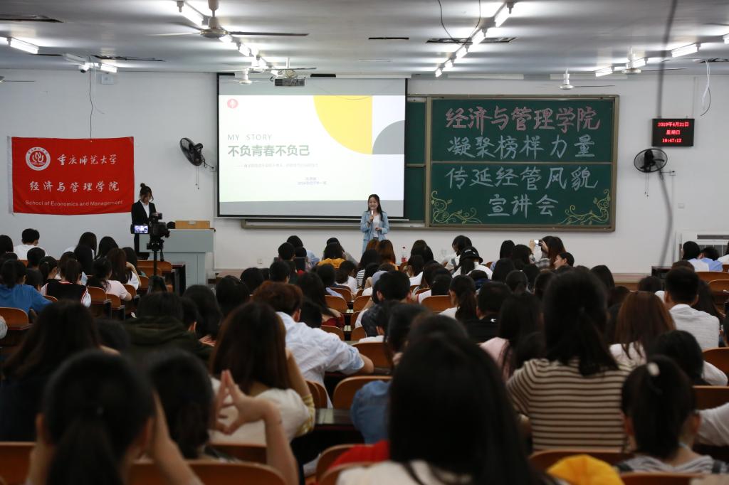 重庆师范大学2017-2018学年度优秀学生干部代表16级财务管理专业的周宁敏、17级经济学专业孙宇、17级财务管理专业赵文霖同学分别以“用心对待遇见”“敢做追梦者,争当新青年”“改变完成转变”为主题,与在场的同学分享了如何做好学生干部的心得。同时,三位同学都建议大家要将理论知识与实践相结合,达到学以致用的目的,要勇于勇于担当,不断前行。特别是学生干部要在老师和同学服务的过程中感受到了工作的意义和乐趣。