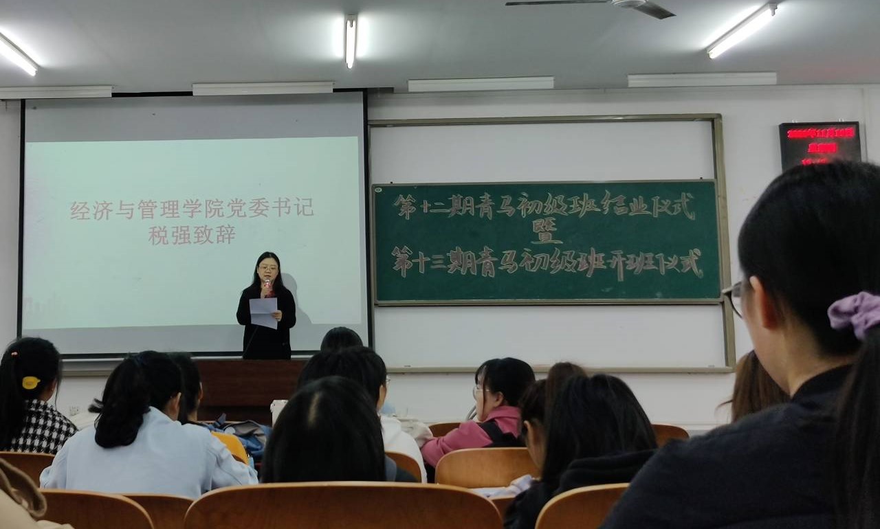 党委书记税强、辅导员罗姝、全体青马初级班成员及往届优秀学员参加了本次仪式。在整齐嘹亮的共青团团歌的奏唱声中,开班仪式拉开序幕。会上,税书记向第十二期结业学员表示祝贺,并希望和要求第十三期学员能加强理论素养,坚定理想信念;坚持知行合一,勇于实践;争当先锋模范,甘于奉献社会。随后,辅导员罗姝宣读了第十二期青马班优秀学员名单,宣读结束后,税书记和罗姝老师一起为优秀学员颁发证书。紧接着,第十二期“青马班”优秀学员代表刘畅上台发表感想,他表示,要坚定跟党走好中国特色社会主义道路的信念,认真上好每一堂课,积极参加每一次实践活动,不负青春,不负韶华。
