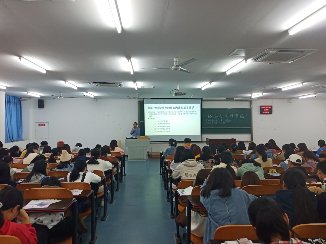 活动伊始,王亚飞教授以自身的职业发展历程为开端,强调职业提升规划对自身职业发展的影响与帮助,鼓励学生要注重自身的发展与突破。随后,王教授结合国内外当下发展变化的形式向学生详细阐述了弘扬科学精神的三个时代背景。其一,中国经济高质量的发展以及科技实力和综合国力的全面提升;其二,习近平总书记在科学家座谈会上提到,面向时代前沿和国家科技需求,应当发扬爱国精神,依靠改革创新,铸造科技成就;其三,知识经济条件下,国家与国家、企业与企业之间竞争的焦点从来都是科技和人才。王教授强调,青年学生目前最大的竞争优势就是创新能力,而如何通过以职业需求为主要导向,来强化学习能力和创新能力,更是学生当下需要关注的重点内容。
