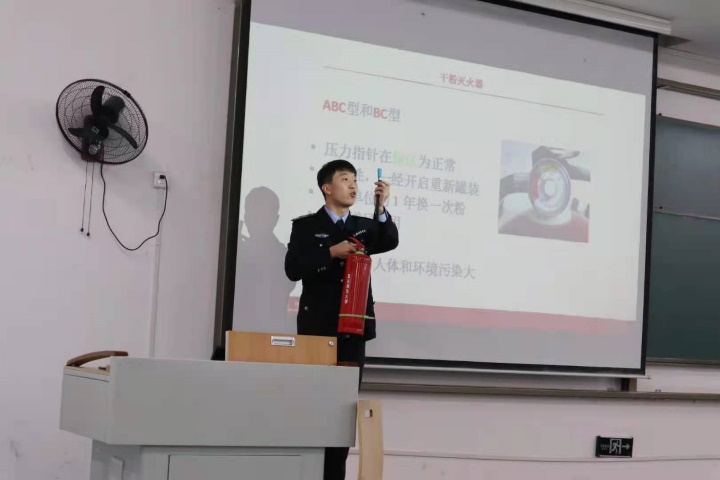 首先,傅玉年教官结合典型视频案例,介绍了火灾初起、发展、猛烈、衰退、熄火等五个发展阶段,讲解了日常生活和工作中火灾发生的原因、火灾所造成的严重后果,并就如何预防火灾、如何在火灾现场逃生自救以及如何充分利用和操作灭火器等现代消防设施设备自救方面做出了详细指导。