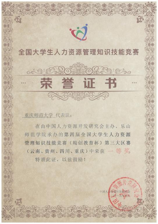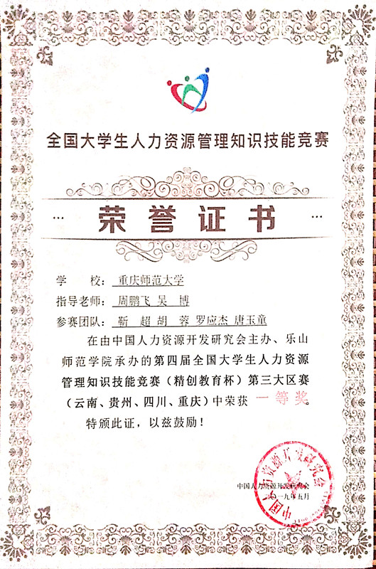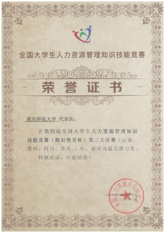 参加第四届全国大学生人力资源管理知识技能竞赛(第三大区赛),斩获第四届全国大学生人力资源管理知识技能竞赛第三大区赛一等奖和最具潜力奖。