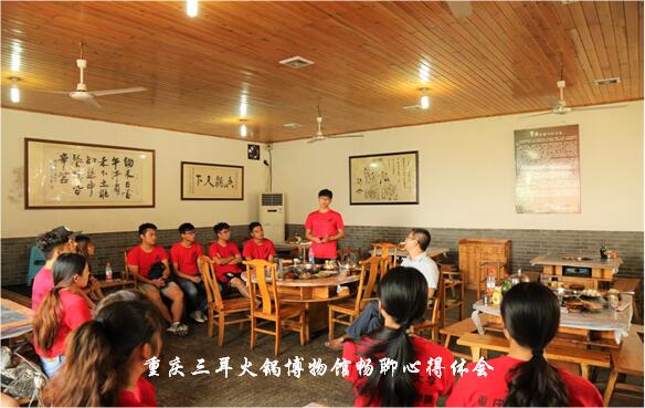 8月23日上午九点,全体人员坐上返程校车,返校途中参观了重庆三耳火锅博物馆,并在该处借饭前闲暇举行全体人员总结大会,成员们各抒己见,畅所欲言,场面温馨和谐。饭后全体乘坐校车返校,卸去一身的疲惫准备迎接第二天的后山拉练。