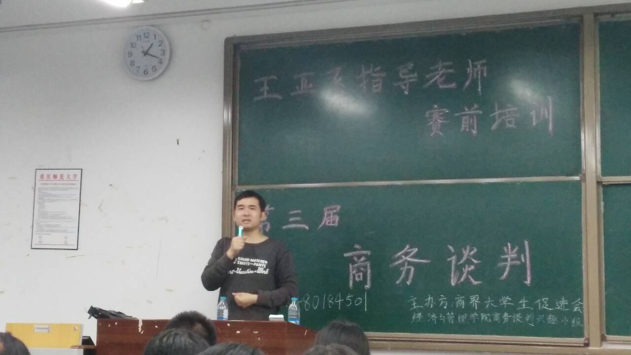同学踊跃报名参加,其中更有院级以及校级辩论队参赛,使得此次比赛竞争激烈。会上,王亚飞老师围绕商务谈判赛前准备,赛中发挥以及赛后总结三个要点展开详细介绍,他告诉参赛选手们,尽管只是模拟谈判,但谈判中所运用的知识确实扎扎实实的,这就需要选手们多看多记,积累专业的经济学知识,赛前要做好预案,赛时要能随机应变,赛后总结要到位。选手们就王亚飞老师讲说中不理解得地方提出问题,王老师都一一耐心解答,他的回答生动有趣,妙趣横生,整堂大会气氛活跃。活动的最后,王亚飞老师告诉选手们应该多看看网上的商务谈判案例,做好赛前工作,走稳第一步,并祝愿每位选手能取得优秀成绩。