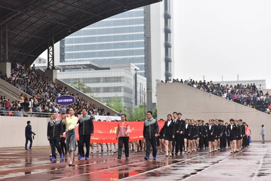 师生代表们组成的特色方阵,身着正装的他们,气宇轩昂,身姿挺拔,仿若时代的精英,以整齐的步伐与嘹亮的口号亮相在田径场上,赢得满场的掌声。