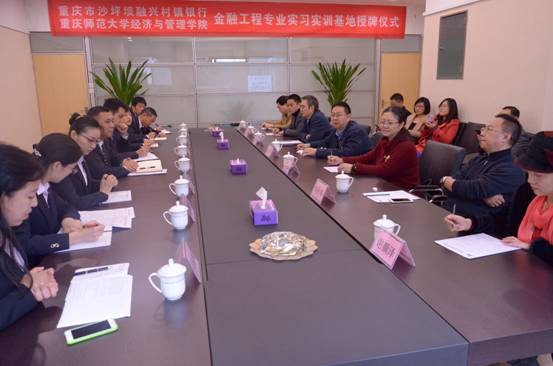 20151116日,麻将游戏电脑版 与重庆市沙坪坝融兴村镇银行共建“金融工程专业实习实训基地”挂牌仪式隆重举行,共同揭开重师麻将游戏电脑版 与重庆融兴村镇银行的产学合作序幕,标志着校企双方迈向携手共赢的开始。麻将游戏电脑版 院长田盈、党委书记税强、重庆市沙坪坝融兴村镇银行行长巩伟、沙坪坝区金融工作办公室谢颜泽共同为“金融工程专业实习实训基地”进行了揭牌。参加仪式的麻将游戏电脑版 领导和金融工程系教师代表与重庆融兴村镇银行领导和员工代表进行了座谈,双方围绕学生实习制度的建立、实习计划的落实、专业教师的考察学习以及研究课题合作等事宜展开了讨论,并就上述问题达成了共识。
