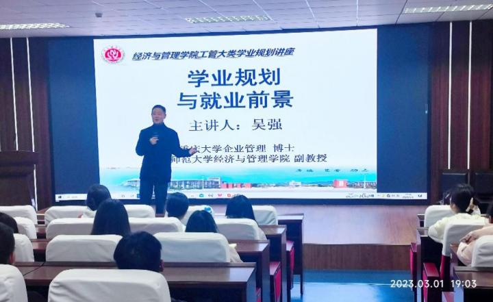 3月1日晚,工商管理大类教师指导天团分4个场地同时为260多名工商管理大类的学生开展学业发展规划指导。人力资源管理系万鹏宇博士在求是楼220以商界、政界、学界的成功案例以及自身的学习成长经历为主线,辅之以国学教育,对学生学业发展进行了指导,展现了深厚的人文科学功底,系主任周鹏飞教授就学生目前在专业学习方面的困惑与学生进行深入交流。市场营销系吴强博士在求是楼517围绕学业规划的重要性、自我发展目标的确定、专业未来就业形势等学生关心关注的问题,用数据说话,诙谐幽默地解读了数据背后的事实。