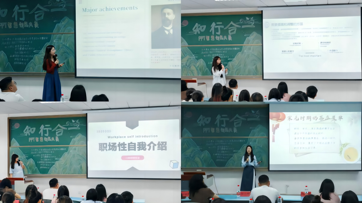 本次赛事共分为师范类与非师范类两大组别,决赛选手们按照赛前抽签顺序依次登台,在汇报过程中始终聚焦“知行合一”的主题,以沉着冷静、自信从容的态度向评委老师们展示其设计理念、制作思路、视觉效果及内容元素等,彰显了青年学生奋发向上的良好精神风貌。