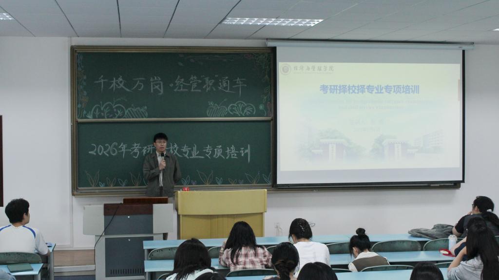 在求是楼421举办2026年考研择校择专业专项培训。本次培训会由2022级辅导员张源老师主讲,140余名意向考研同学的参会。