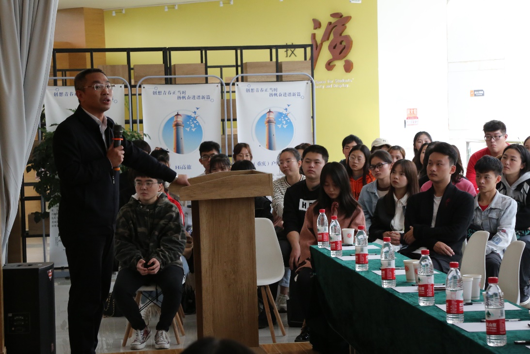 2002级校友江光伟首先发言,他结合自身经历就信念与信心、目标与坚持、遗憾与包容、学习与提高、忠义与厚道五个方面的内容给大家做了分享,勉励同学们面对艰难要咬牙坚持,逐步搭建人生基石,也表达了对学弟学妹们都能“立鸿鹄志,做奋斗者”的真诚期望。随后,重庆群荣电子科技有限公司副总2001级校友吴昊和重庆机电集团股份有限公司(风电公司)综合管理部部长2009校友田酸分别从校园和职场两个方面向大家分享了学习成长的经验和感悟,鼓励同学们好好利用大学四年学习专业知识、抓住机会磨炼自己,给自身增加“砝码”。