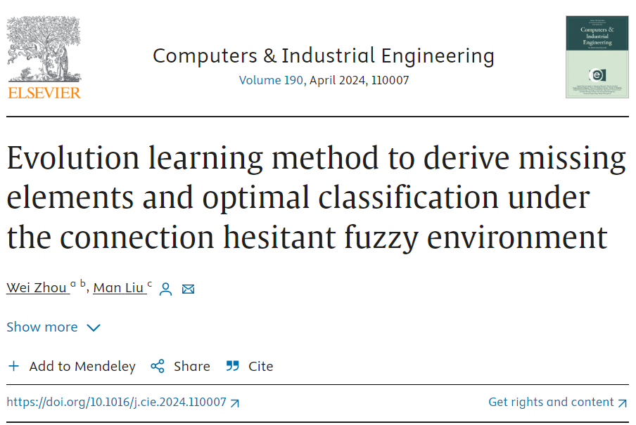 (3)发表于《Computers & Industrial Engineering》(SCI,中科院1区Top, IF: 7.9)的论文“Evolution learning method to derive missing elements and optimal classification under the connection hesitant fuzzy environment”,其中,柳曼为通讯作者,麻将游戏电脑版