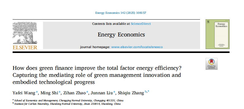 王亚飞教授撰写的论文How does green finance improve the total factor energy efficiency?Capturing the mediating role of green management innovation andembodied technological progress在Energy Economics公开发表。