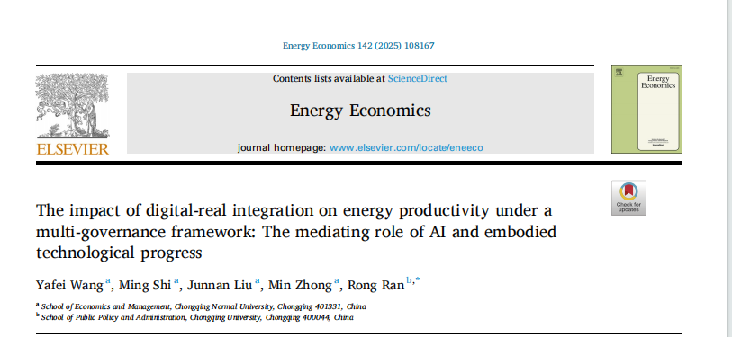 王亚飞教授撰写的论文The impact of digital-real integration on energy productivity under amulti-governance framework: The mediating role of AI and embodied technological progress在Energy Economics公开发表。