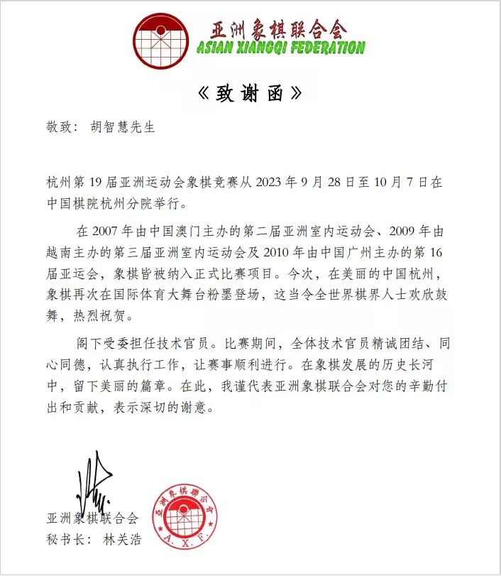 近期,杭州第19届亚运会落下帷幕,热烈祝贺麻将游戏电脑版 经济系教师胡智慧受邀担任杭州第19届亚运会9月28日-10月7日象棋项目国际技术裁判员并获表彰!