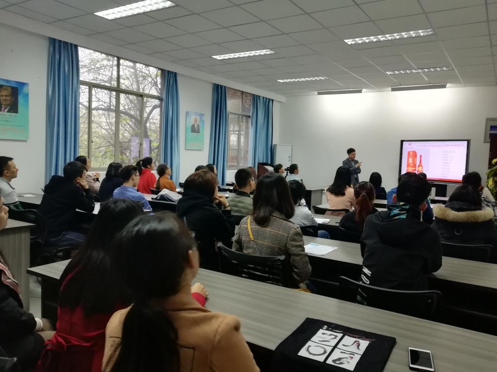 宣讲会伊始,宣讲人裴振禹通过PPT对四川郎酒公司的悠久历史、发展现状、公司规模及相关产品为学生们做了相关介绍。郎酒集团(全称为四川郎酒集团有限责任公司),是一个以生产销售中国名酒——郎酒为主业的大型现代化企业集团,厂区所在地地处四川古蔺县二郎镇。 郎酒始于1903年,产自川黔交界有“中国美酒河”之称的赤水河畔。从“絮志酒厂”、“惠川糟房”到“集义糟房”的“回沙郎酒”开始,已有100年悠久历史。宣讲人裴振禹对公司的介绍细致入微,并结合自己的亲身经历给学弟学妹们做分享,现场的氛围非常的融恰。