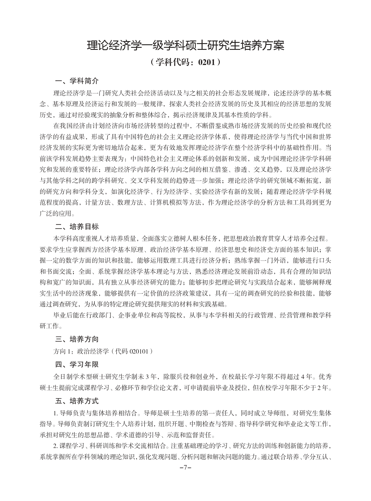 理论经济学一级学科(政治经济学二级学科)硕士研究生培养方案
