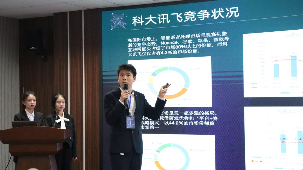 决赛现场,选手按事先抽签顺序对内容进行 10 分钟陈述,并完成评委 5 分钟的问答。选手们通 过对企业财务数据采集、挖掘、清晰,借助财务报表深入分析企业财务状况、风险,给出业务发展 建议,展现了扎实的财务专业知识、娴熟的数据处理技能、较强的问题解析能力。