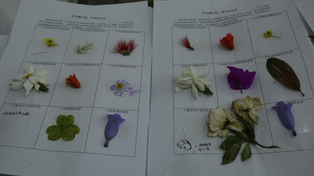 在活动过程中,各位参赛学生依据工作人员提供的重师手绘地图,于绿化带、三春湖沿岸以及图书馆等地,感受万物生长的活力,悉心选取蓝花楹、马鞭草等树叶和花朵素材。运用双面胶、剪刀等工具,将这些素材粘贴至“寻宝图纸”的相应方格,并配以文字诠释,赋予其独特内涵。在整个活动过程中,所有参与者始终保持高度热情,在心灵的解码中培养对生活、自然的热爱。他们以脚步测量校园的每一寸土地,通过双手感受和接近自然,借助五感探索校园中的美好与真实,尽情体验自然界多样色彩所激发的情感。